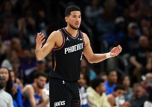 太阳主将布克本场比赛开局就展现不错状态砍下12分,但他下场休息时球队就处于劣势,第四节他遭遇严防队友也无法打开局面。