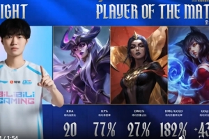 体育资讯4月19日讯 昨日LPL第二赛段BLG战胜IG,赛后BLG中单Knight发布对阵IG个人高光,并配文:KD 20,再获全场最佳!